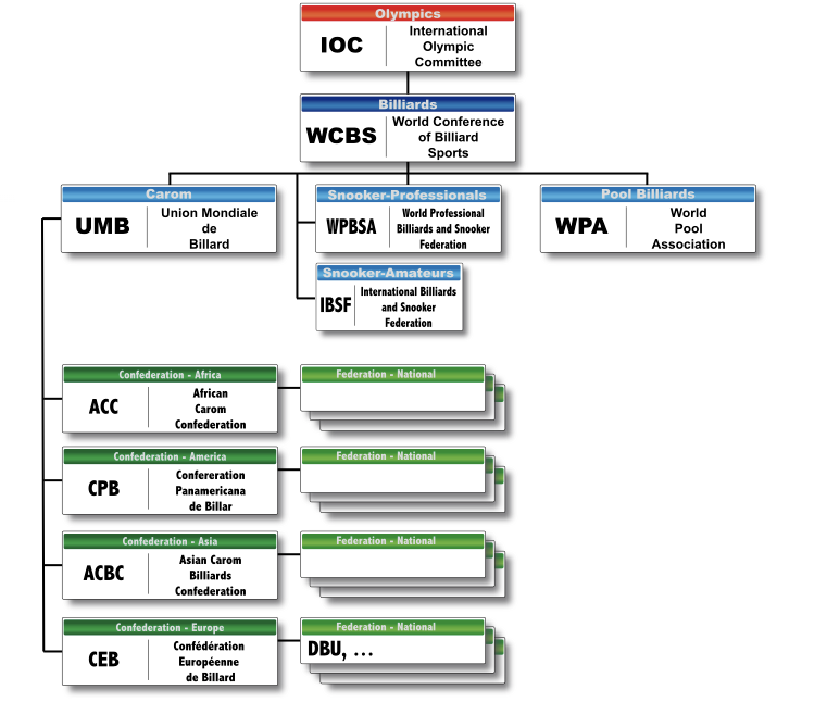 UMB와 ACBC에 대하여 더 궁금한 사항은 세계당구연맹 UMB홈페이지 또는 아시아 당구연맹 ACBC홈페이지를 참고 바랍니다. 기타 IOC산하에 있는 각 대륙 및 국가의 당구연맹 조직이 궁금하시면 위의 표를 참고바랍니다.