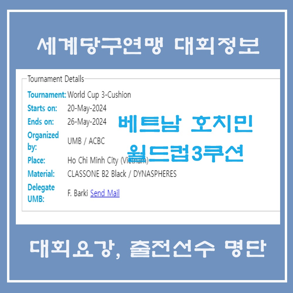 당구 좋아하시나요? 프로당구 PBA투어든 UMB 세계당구연맹 주관 대회이든 당구로 즐거움을 채울 수 있다면, 당구팬으로서는 그만한 게 없을 것입니다. 오늘은 2024년 5월에 열리는 베트남 호치민(호찌민)에서 열리는 3쿠션(쓰리쿠션) 월드컵 대회요강, 경기방식 및 출전선수명단을 정리했습니다.
