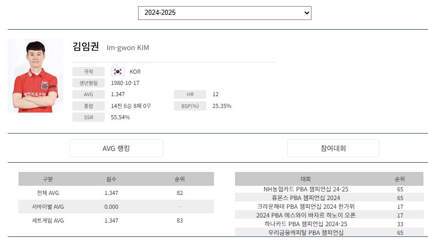 1.4. 김임권 PBA 투어 종합 전적 및 승률