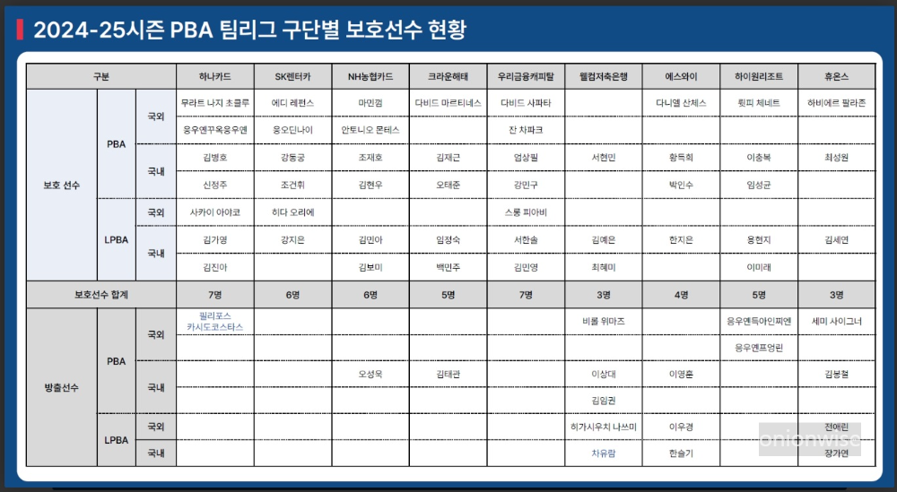 ■ 프로당구 2024-25시즌 PBA 팀리그 구단별 보호 선수 명단