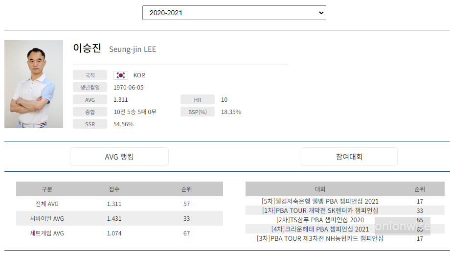 2) 프로당구 2020-21 시즌, 이승진 당구선수 PBA 투어 경기지표