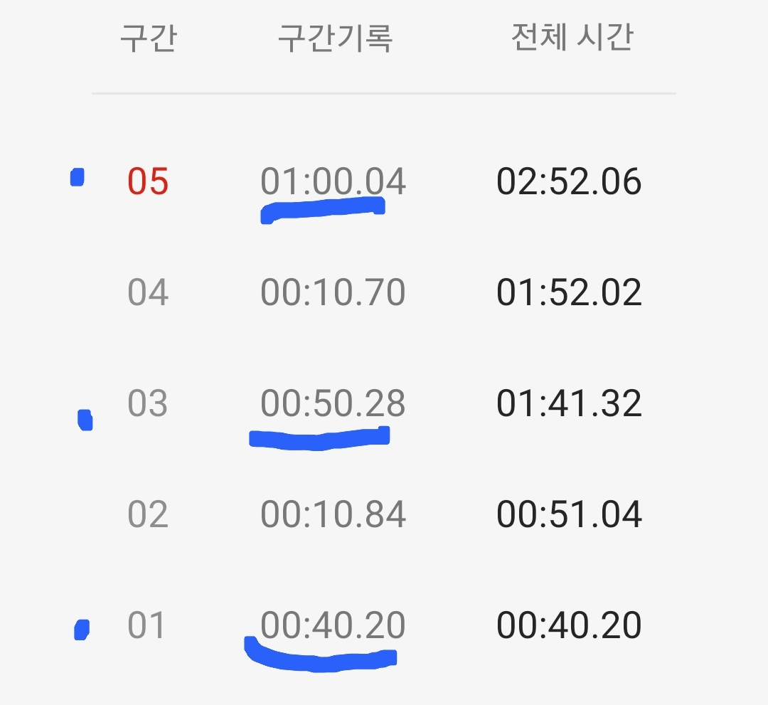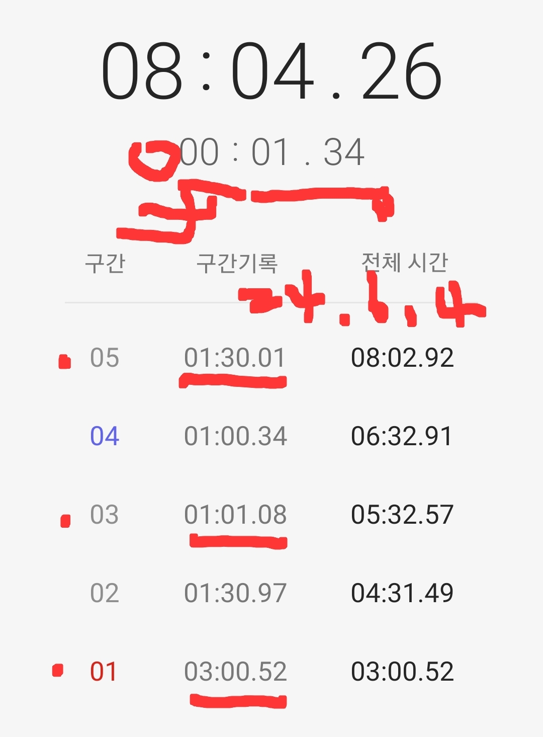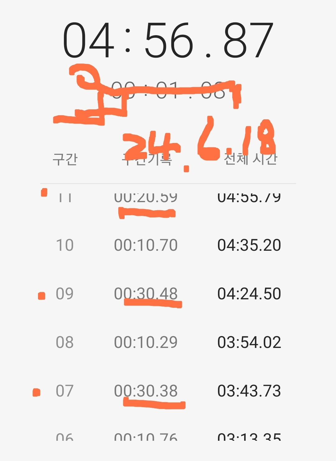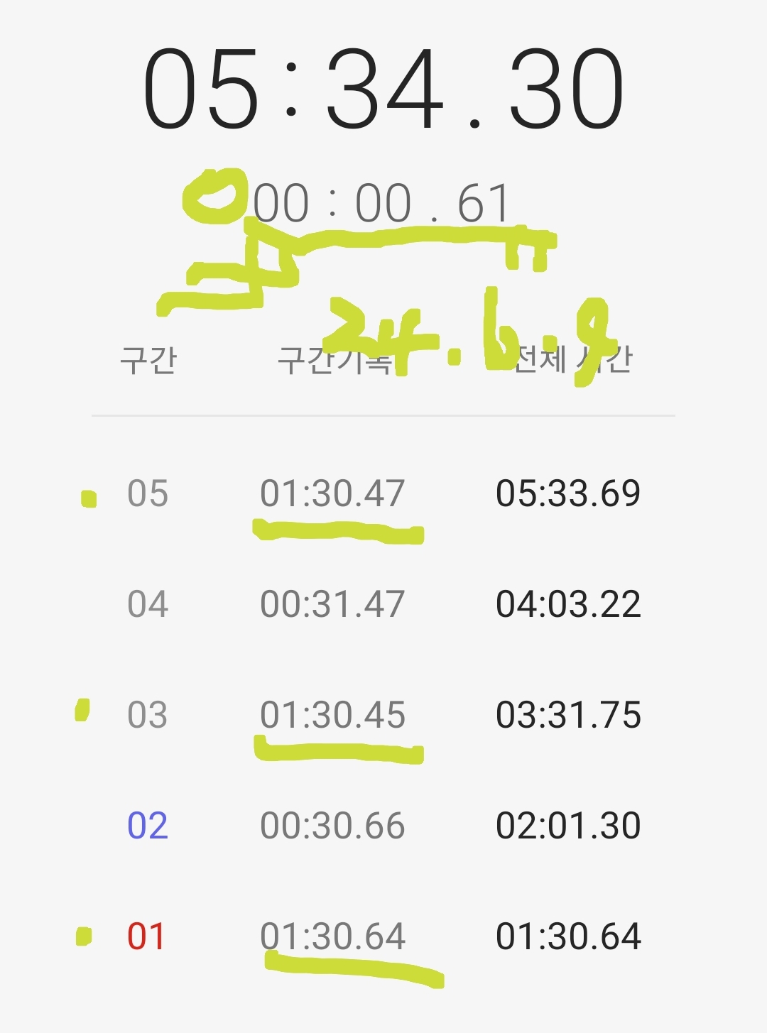 마음같아서는 한달전 1차 목표 3분 도전 때 3분 32초 달성 경험으로 4분 30초 정도 기록할 것으로 기대했는데 쉽지 않은 도전임을 절감했다.