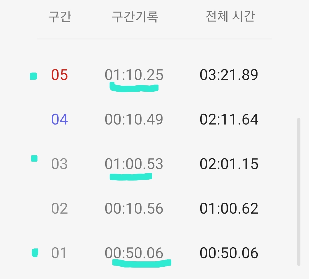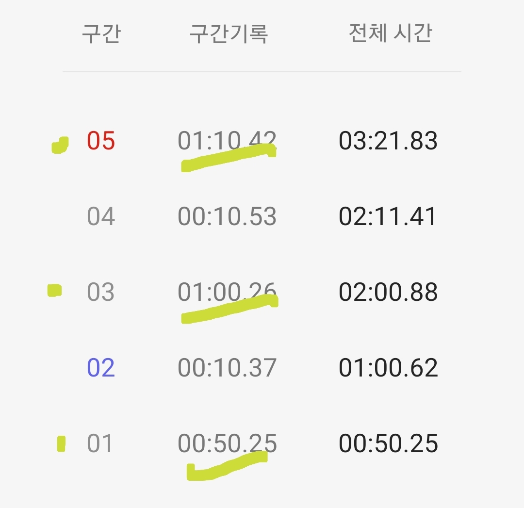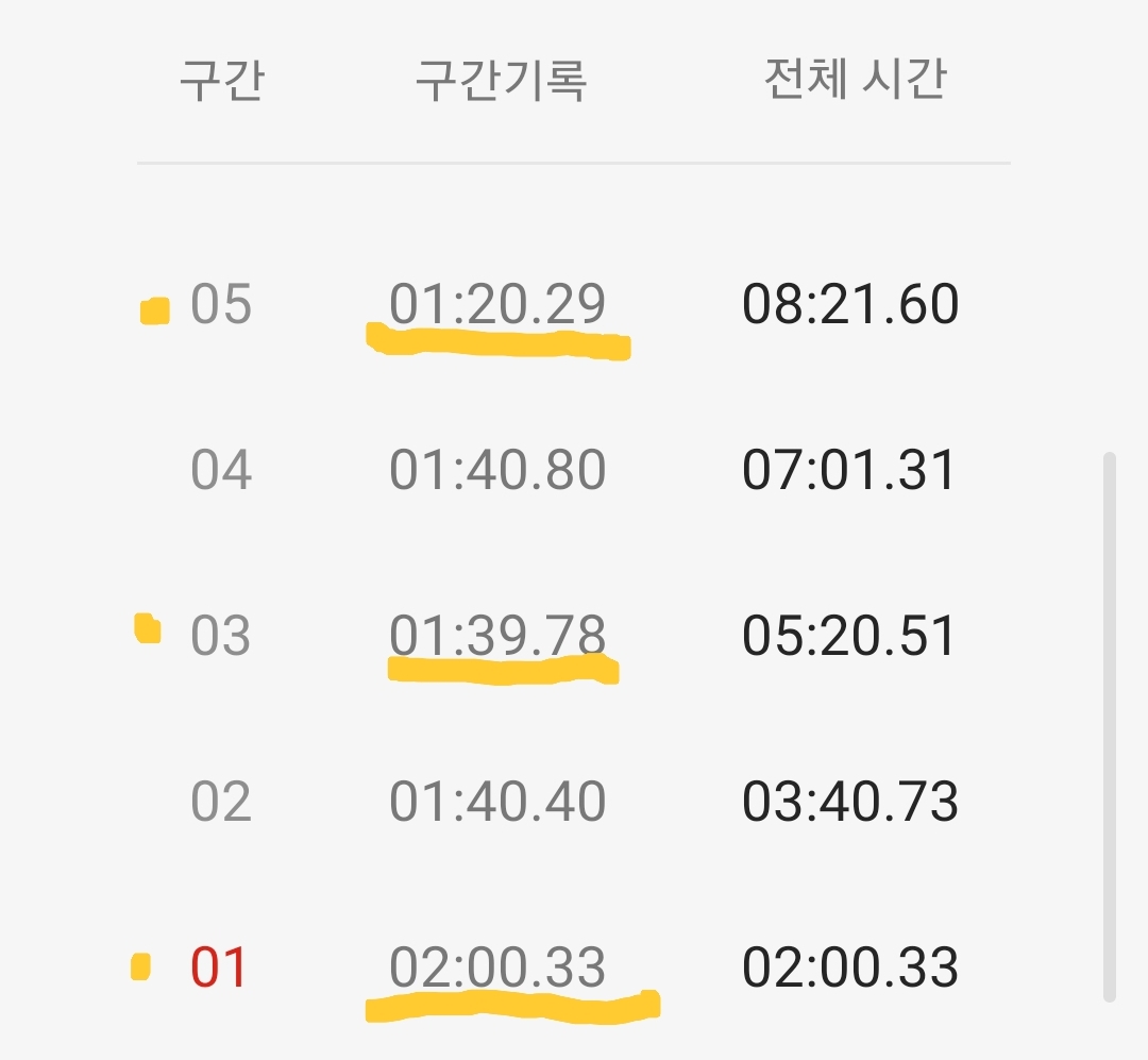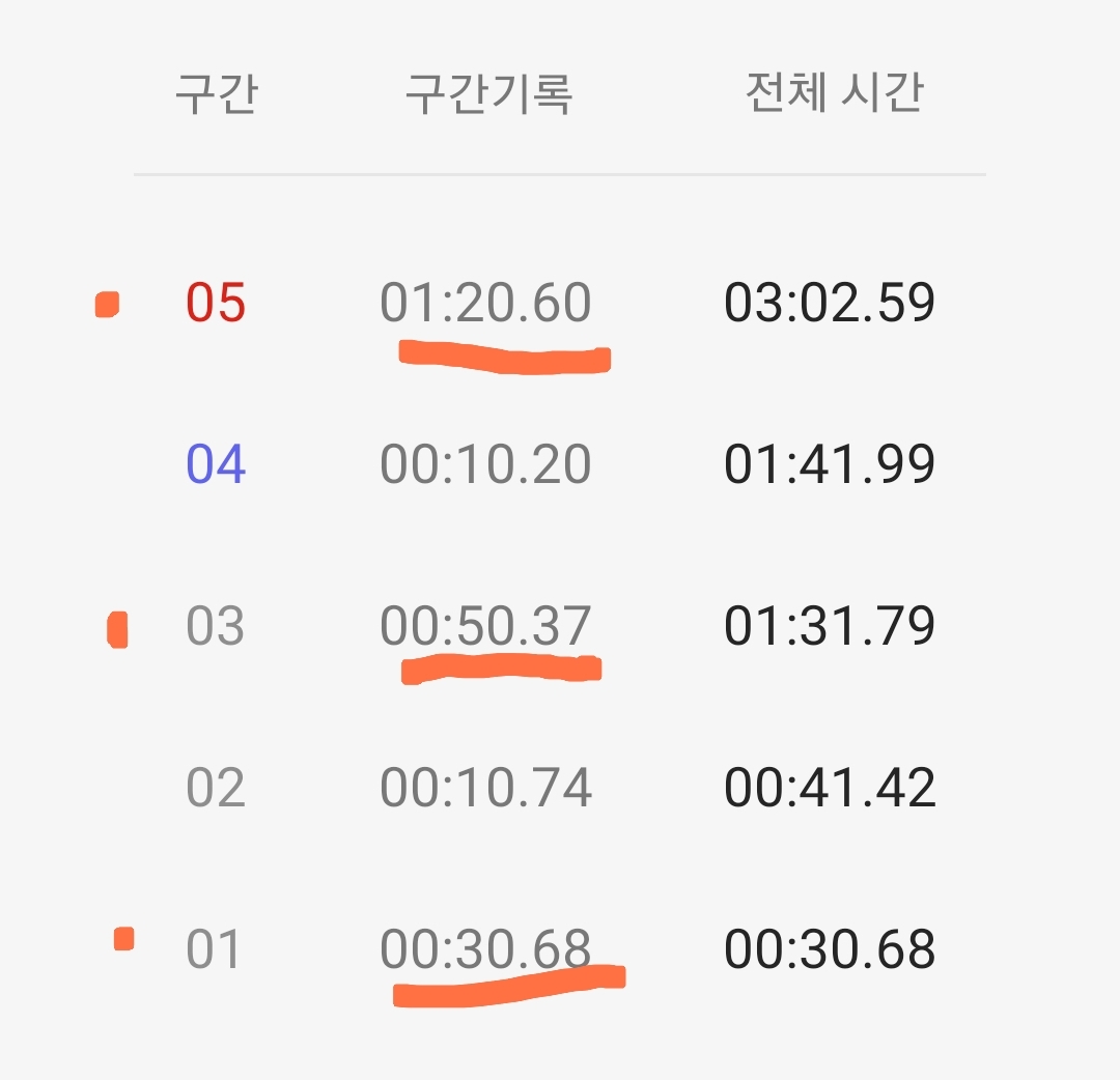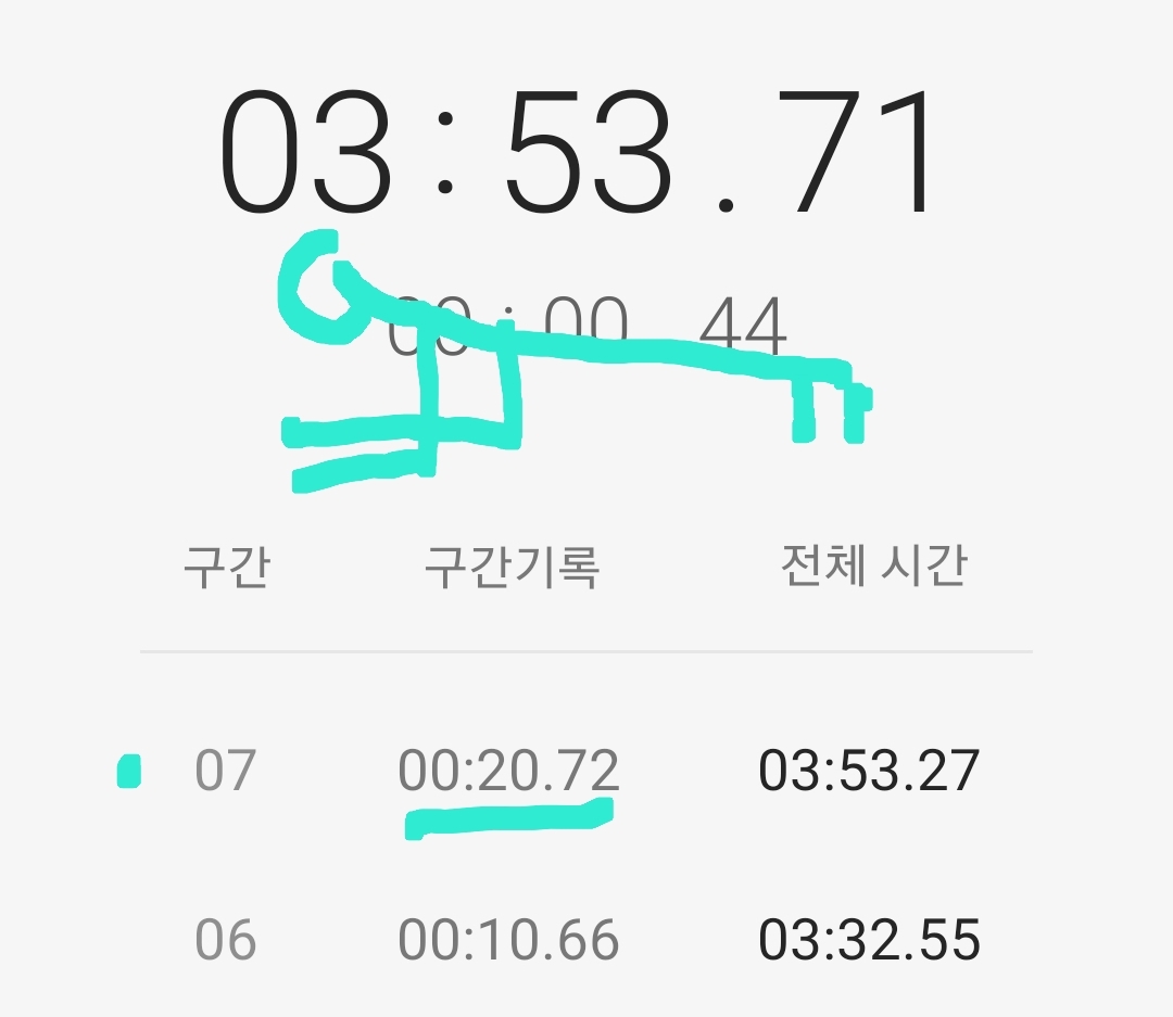 마음같아서는 한달전 1차 목표 3분 도전 때 3분 32초 달성 경험으로 4분 30초 정도 기록할 것으로 기대했는데 쉽지 않은 도전임을 절감했다.