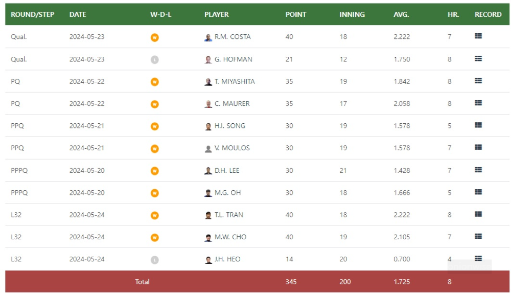 ■ 2024 호치민 당구 월드컵 예선라인드 - 쿠드롱 경기결과