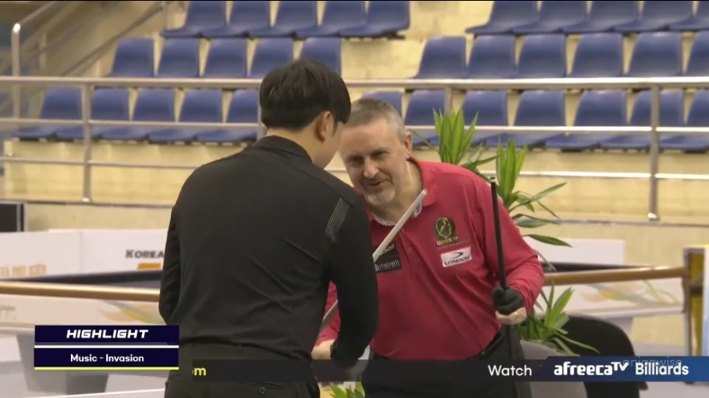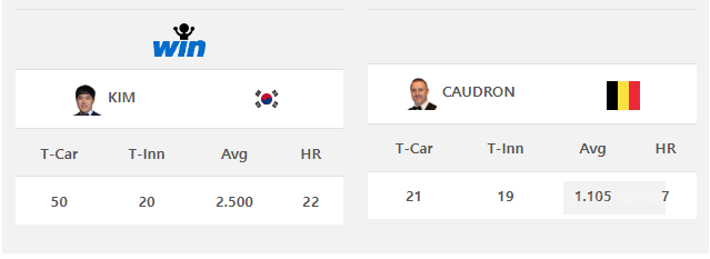 쿠드롱은 애버리지 1.923, 하이런 11 득점으로 조명우(애버리지 1.640, 하이런 12 득점)를 비교적 손쉽게 물리쳤습니다.