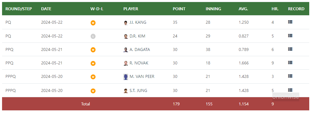 비롤 위마즈의 예선라운드 경기결과입니다. 비롤 위마즈는 최근 5년간 UMB 세계당구대회에서 쌓은 랭킹포인트가 없는 상태라 시드를 받지 못하고, PPQ라운드부터 경기를 PQ라운드, Q라운드를 순서대로 거쳐서 32강 예선 조별 리그전에 올라가야 하는 상황이었습니다.