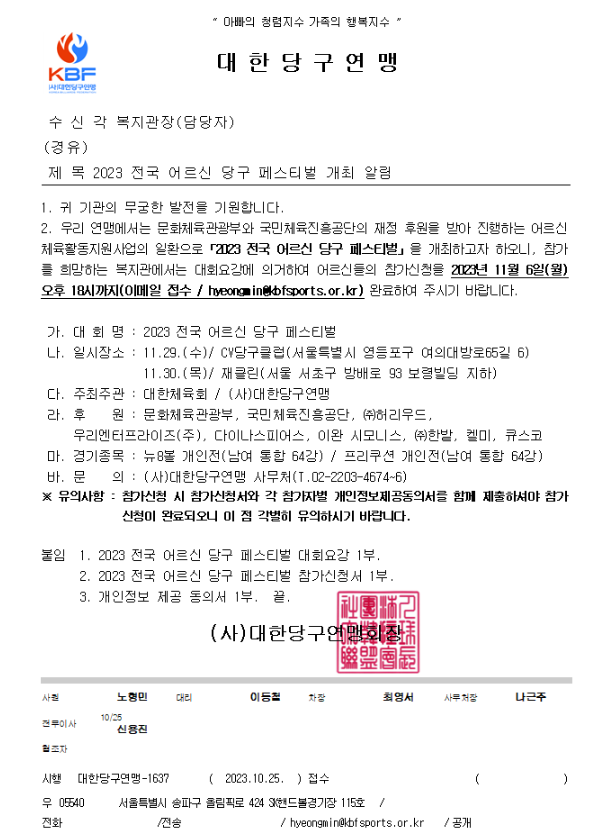 2023 전국 어르신 당구 페스티벌에 참가하고자 하면, 11월 6일까지 담당 복지사에게 이메일로 선착순 접수를 해야합니다. 중복 참가도 가능하며 참가비는 없습니다.