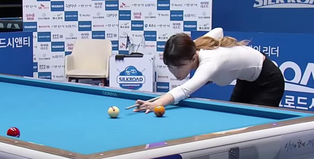 김보라는 다음 순간 제2 목적구인 적구(빨간 공)를 향해 있는 힘껏 샷을 날렸습니다.