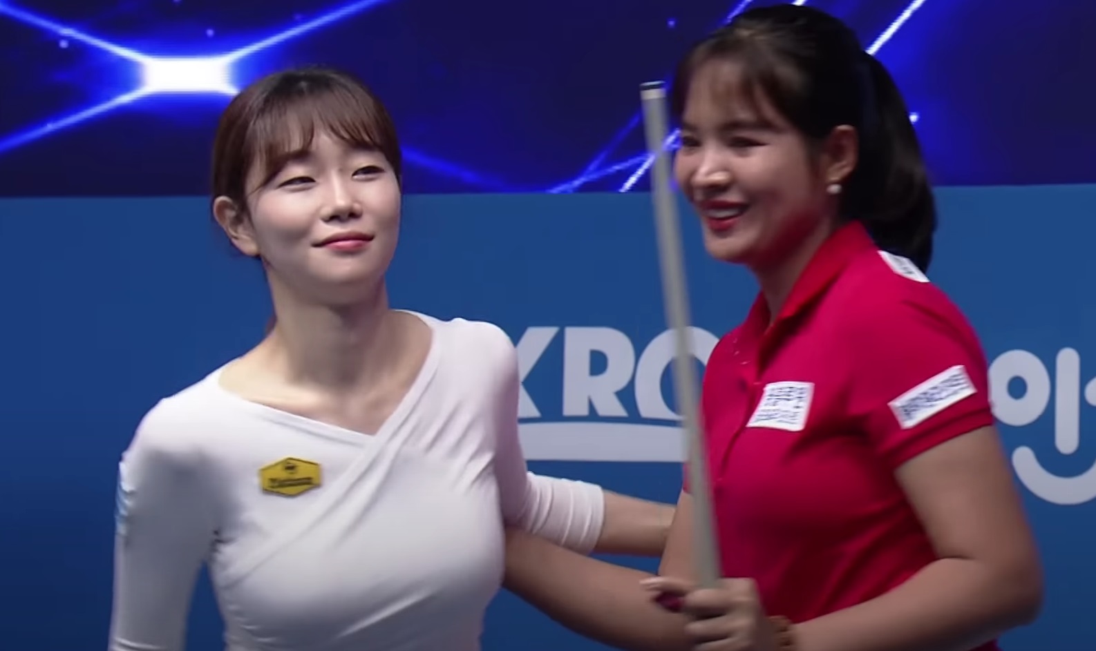 약속한 걸까요? 아니면 카메라 감독이 요청을 한 걸까요? 두 선수가 당구큐를 양옆으로 V자 모양으로 벌리고 멋진 포즈를 취했습니다.