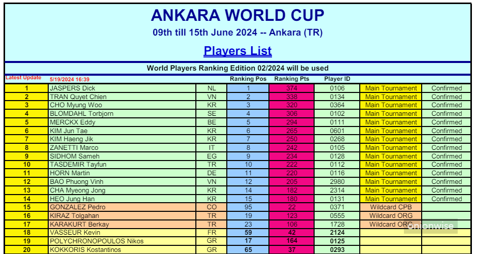 앙카라 세계 3쿠션 월드컵 대회의 시드권자 선수는 총 14명우로 UMB의 2024년 02 에디션 랭킹에 따라 딕야스퍼스를 비롯하여 허정한 선수까지입니다.