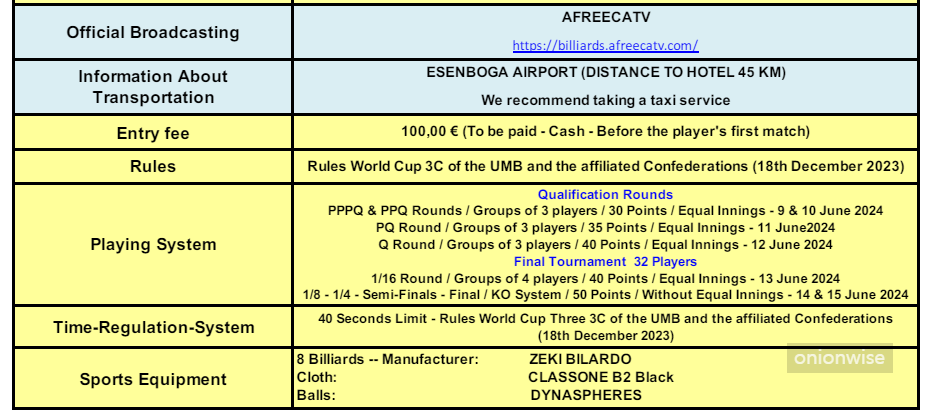 앙카라 세계 3쿠션 월드컵 대회 방송은 아프리카 TV가 맡고 있습니다. 참가비는 100유로(약 15만 원)입니다. 경기규칙은 UMB가 정한 세계 월드컵 3쿠션 경기 룰에 따릅니다.