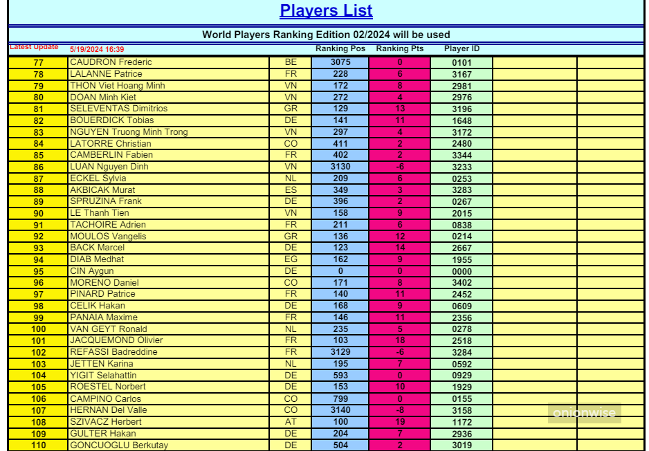 가장 먼저 눈에 띄는 것은 2023년 중순에 PBA 프로당구 무대를 떠난 프레드릭 쿠드롱 선수가 77본에 보입니다. 그런데 지난번 호치민 대회에서 80번대에 보이던 비롤 위마즈 선수의 이름은 다른 장표로 변경되었는지 보이지가 않습니다.