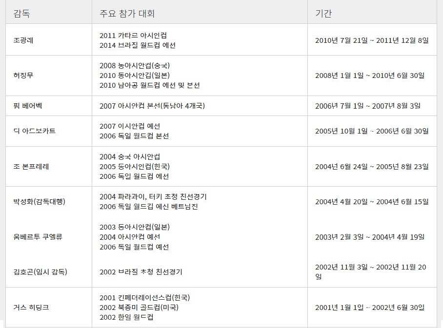 우선 대한민국 남자 축구 A국가대표팀 감독 명단을 한 번 보고 자세한 내용을 살펴보겠습니다.