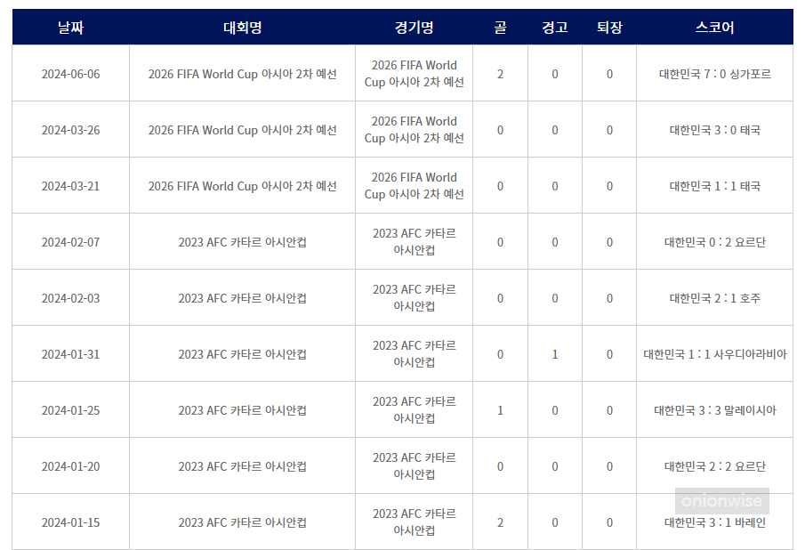 남자 축구 국가대표팀 이강인 선수의 골수 득점 기록 현황입니다. 먼저 오늘 현재 이강인 선수가 국가대표팀에서 넣은 골수 득점기록 전체 현황을 보고 가겠습니다.