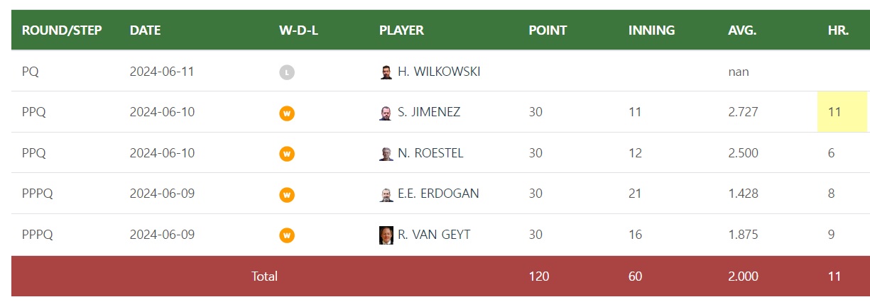 아래 자료는 튀르키예 (구 터키) 앙카라 현지 시각 기준으로 2024년 6월 10일에 끝난 "2024 앙카라 세계 3쿠션 월드컵 당구 대회" PPQ라운드 경기결과입니다. 엊그제 펼쳐진 PPPQ라운드 결과는 아래 자료를 참고 바랍니다.