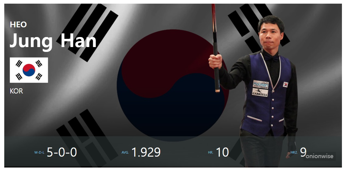 한편 허정한 선수는 32강부터 어느 대회보다 높은 경기력(애버리지)을 기록하며 승승장구하는 모습이었습니다. 앙카라 당구월드컵 16강에서 세계 최강, 딕 야스퍼스를 만났으나 50:30으로 승리하며 앙카라 당구월드컵 8강 진출에 성공했습니다.
