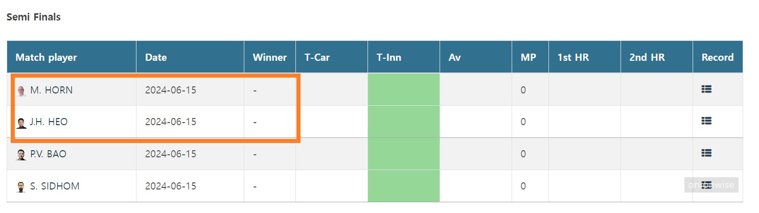 2024 앙카라 세계 3쿠션 당구 월드컵 4강 대진표입니다. 4강 제1경기는 독일의 마크 혼과 한국의 허정한입니다. 4강 제2경기는 베트남의 바오 푸엉빈과 이집트의 사메 시돔입니다. 나머지 세 선수는 현재 UMB 세계당구랭킹에서는 허정한 선수보다 아래입니다.