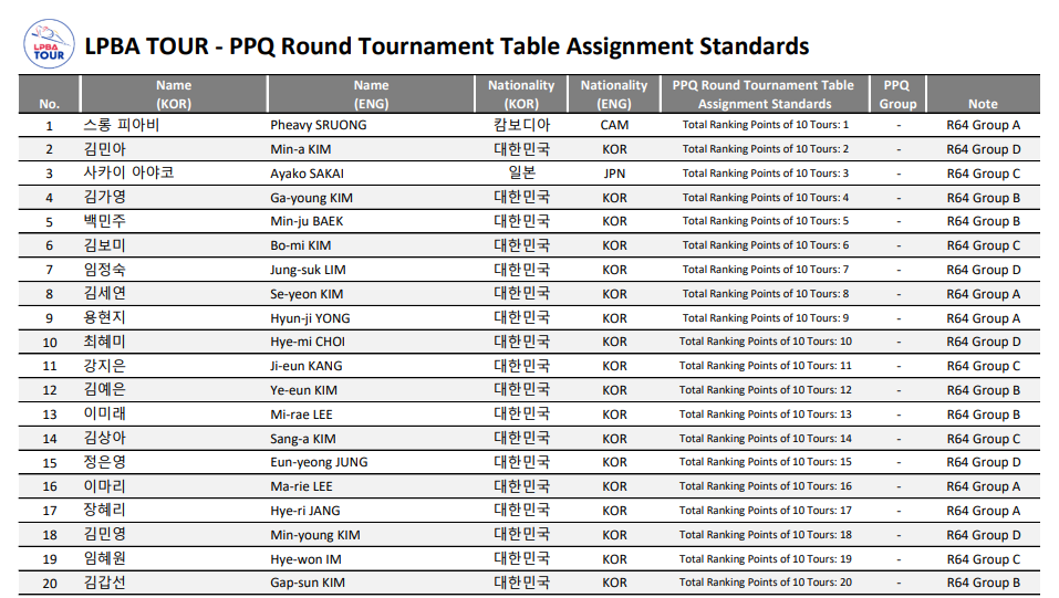 최근 10개 투어의 랭킹 포인트에따른 PPQ라운드 대진표 결정 현황입니다. 1위 스롱 피아비부터 32위에 해당하는 이우경 선수는 64강 시드를 받아서 PQ라운드에서 올라오는 선수를 기다리고 있습니다. 자세한 자료는 아래 첨부 자료 참고바랍니다.