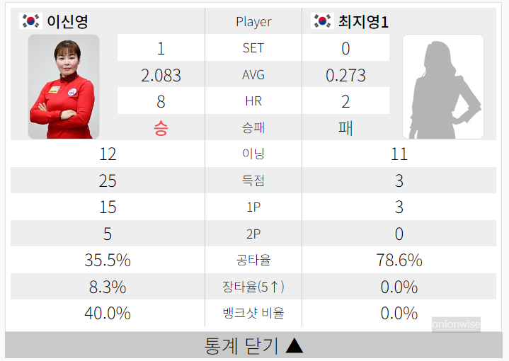 경기결과에서도 알수 있듯이 두 선수는 상당한 3쿠션 경기력 격차를 보였습니다. LPBA 프로 당구선수 이신영의 애버리지는 2.083, 하이런 8점을 기록했습니다.