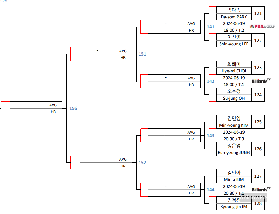| 우리금융캐피탈 LPBA 챔피언십 PQ 라운드 대진표 경기일정 경기시간 (0) | 2024.06.17 |