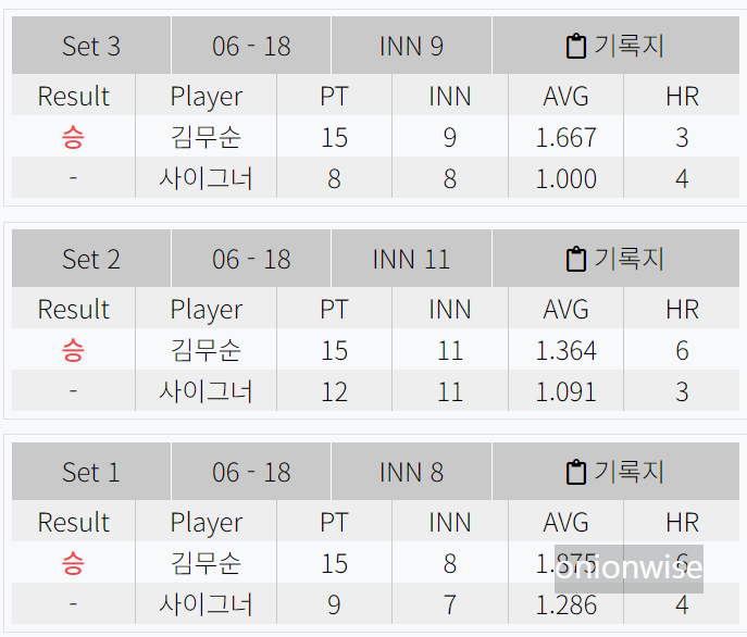 김무순 선수의 관록인가요? 그동안 챌린지투어에서 닦은 내공을 모두 담아서 쏟아 부은 결과일까요? 김무순 당구선수는 튀르키예 당구의 전설, 세미 사이그너를 상대로 애버 1.607, 뱅크샷 비율 17.8%를 기록하며 3개 세트를 15:9, 15:12, 15:8로 대파하였습니다.