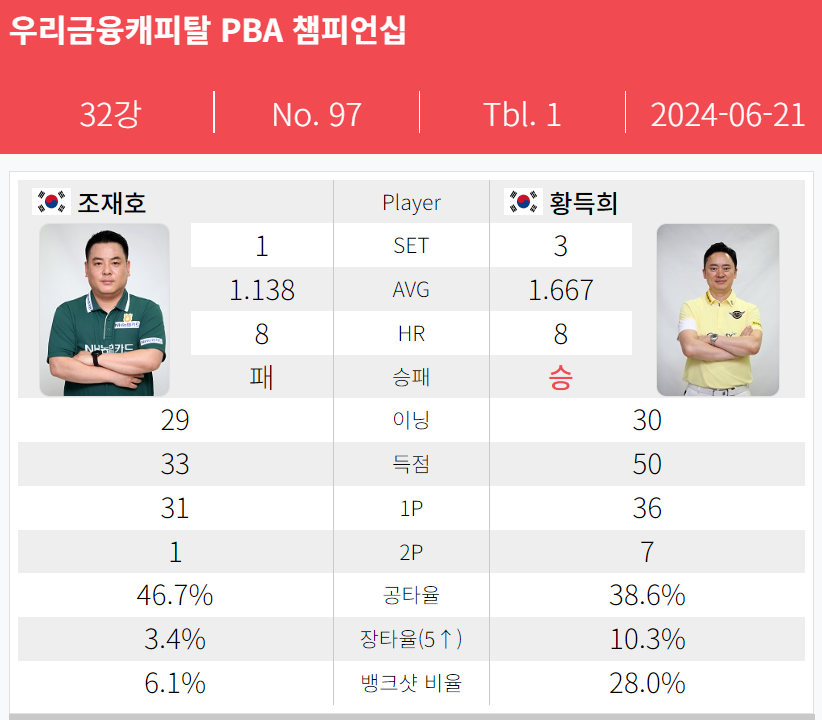 3. 황득희 조재호 경기결과 - 우리금융캐피탈 PBA 챔피언십 32강