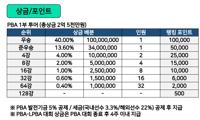 PBA LPBA UMB KBF 당구대회 순위별 상금 - 우승 준우승 8강 16강