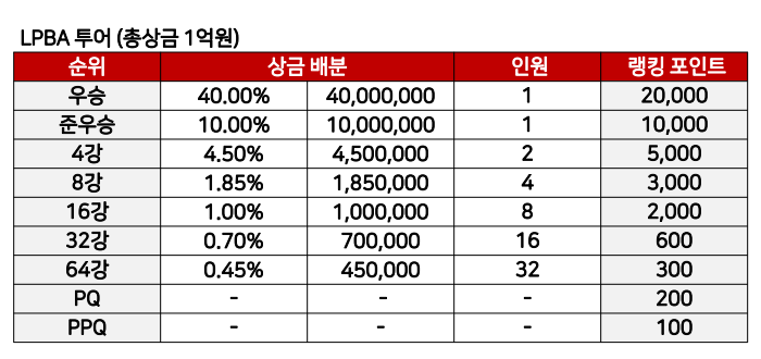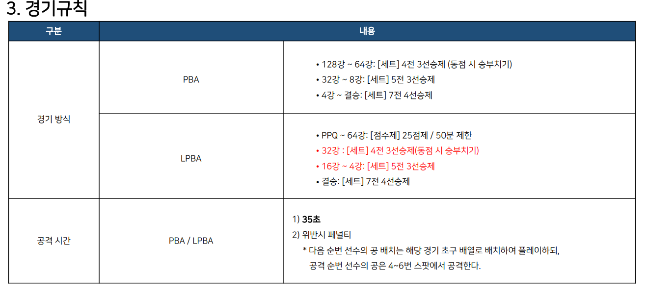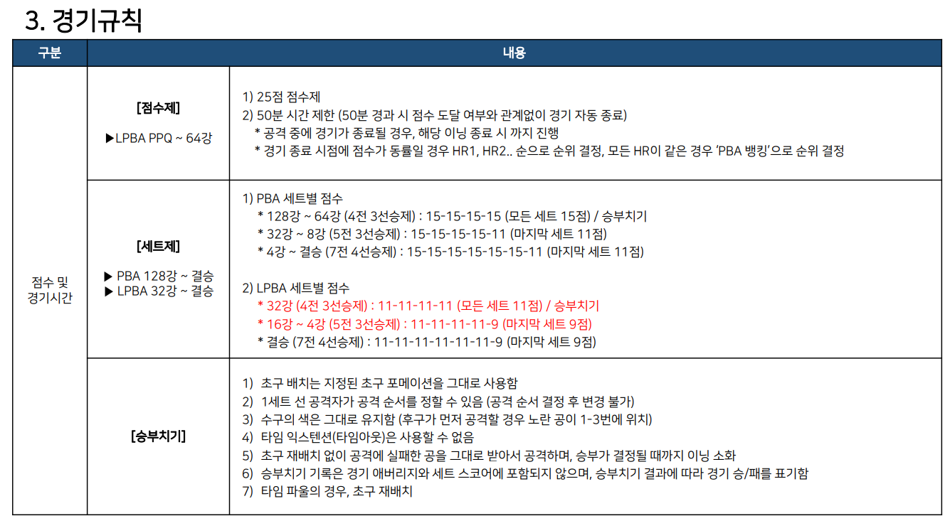 한편 LPBA 투어 경기방식은 점수제와 세트제 경기방식이 병행됩니다. LPBA PPQ ~ 64강까지는 25점제 / 50분 제한 점수제가 적용됩니다. 이후에는 세트제 경기방식이 적용됩니다.