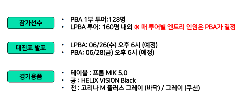 - 대회 참가 시 PBA-LPBA 복장 규정을 반드시 준수하여 주시기 바랍니다.