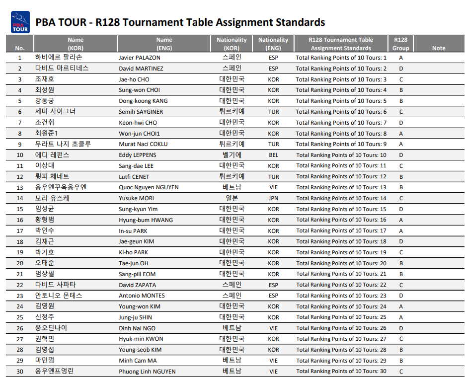 2. (국영문) 하나카드 PBA 챔피언십 - 128강 대진표 적용 순위표