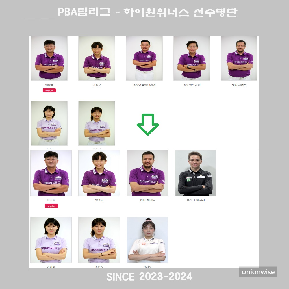 PBA 한국인 남자 선수는 지난 시즌 그대로 이지만, 여자당구선수는 이미래와 짝을 이루어 경기를 펼치던 용현지 선수가 방출되고, 김다희, 임경진, 선수가 새로합류하였습니다. 팀리그 승패에 여자선수들이 차지하는 비중이 증가하고 있는 점을 고려한 것으로 판단됩니다.