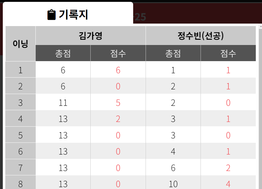 김가영 선로서는 매우 아쉬울 수 있는 경기이지만 더 나은 경기력을 보인 정수빈에게 박수를 보낼 수 밖에 없습니다.