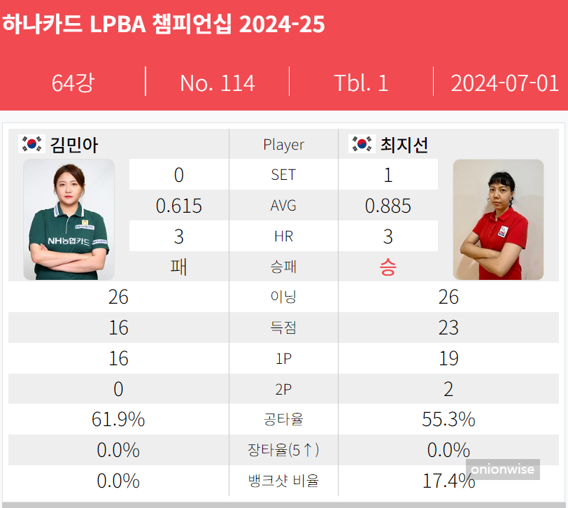 대진결과를 살펴보면 최지선 선수는 애버리지 0.885를 기록하면서 애버 0.615를 기록한 김민아 선수를 23:16으로 꺾고 LPBA 투어 최초로 32강에 진출하였습니다.