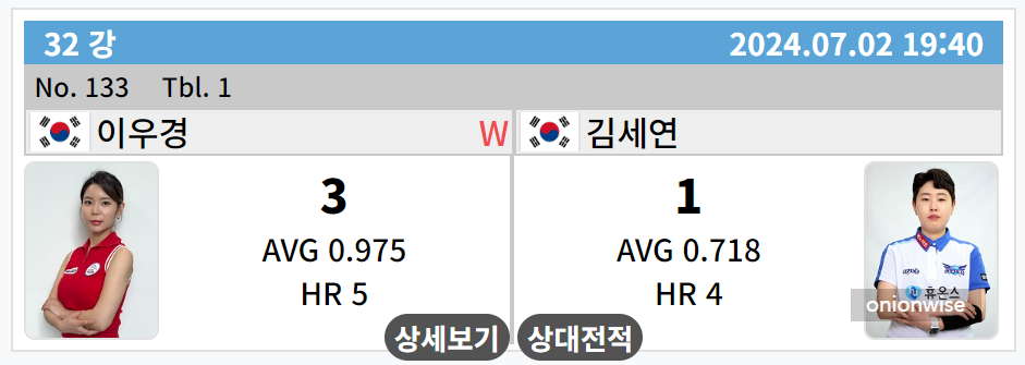 이번 시즌에는 PBA팀리그 당구팀에서도 방출된 아픔이 잇는 선수입니다. 그런데 32강 경기결과는 이우경 선수가 김세연 챔피언을 이겼습니다.