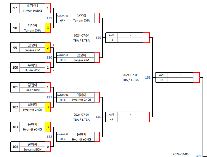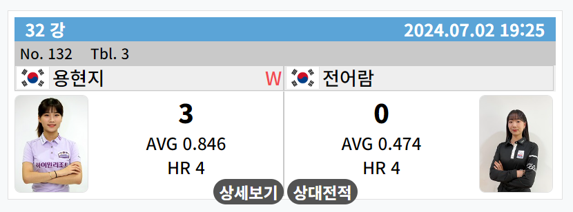 잠깐 두 선수간의 하나카드 LPBA 챔피언십 32강 대진표를 들여다 보면, 전어람 선수를 이긴 용현지 선수는 32강에서 김진아 선수를 이기고 16강에 진출한 최혜미 선수와 7월 4일 하나카드 LPBA 챔피언십 16강 경기를 펼칩니다.