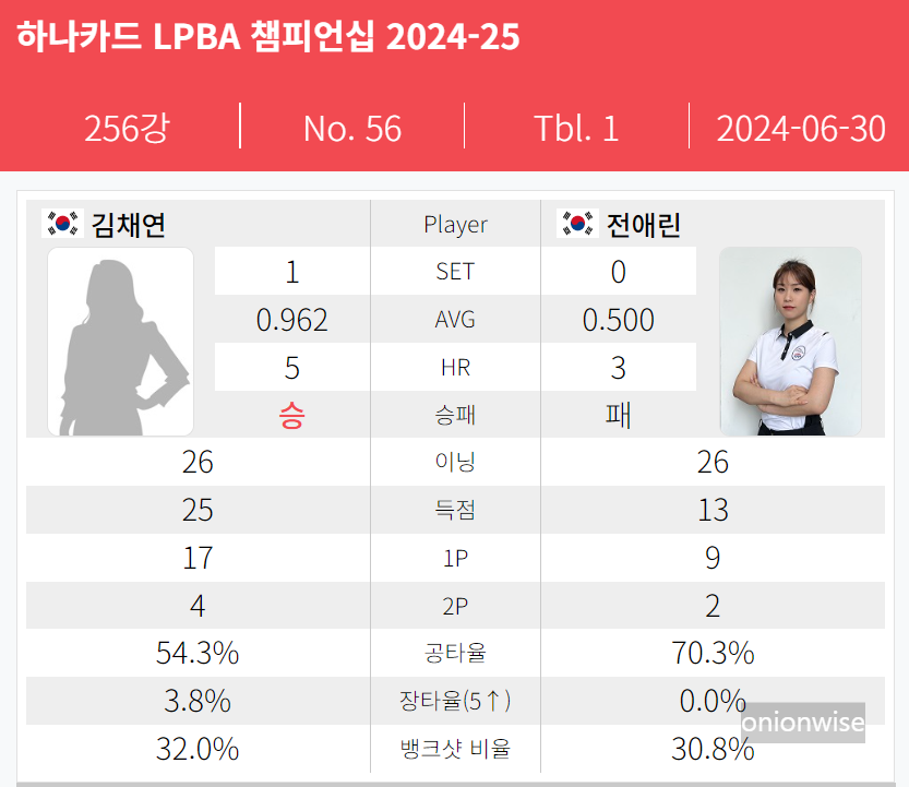 그런데 지난 개막전 오도희 선수와의 경기 결과 잔상이 남아 있었을까요? 전애린은 PPQ 라운드에서 LPBA투어에서는 무명에 가까운 김채연 선수를 만나 25:13이라는 큰 점수차로 패하면서 PQ라운드도 올라가지 못하고 탈락하고 말았습니다.
