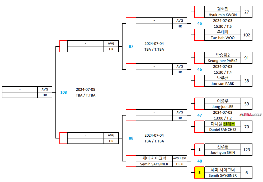 | 하나카드 PBA 챔피언십 128강 1일차 경기결과 - 64강 대진표 (0) | 2024.07.03 |