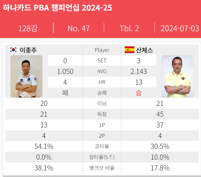 조금 전 7월 3일 14시 3분경에 끝난 두 선수간의 경기에서 다니엘 산체스가 이종주를 세트 스코어 3대 0으로 완승을 거두고 하나카드 PBA 챔피언십 64강 대진표에 이름을 올렸습니다.