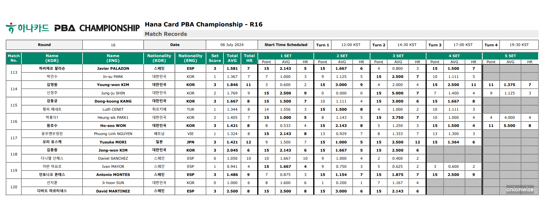 1. 하나카드 PBA 챔피언십 16강 경기결과