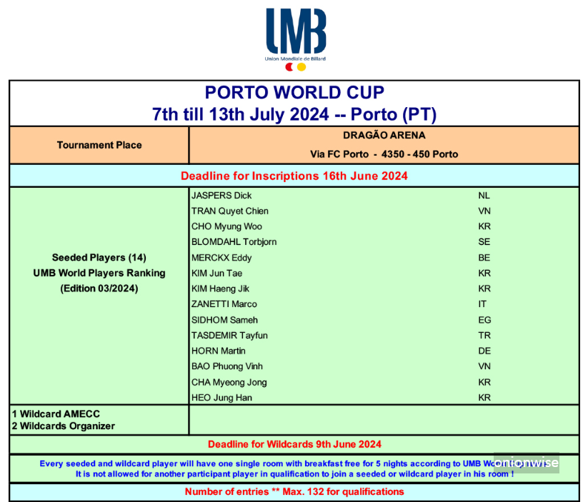 포르투 3쿠션 당구 월드컵 14명의 시드 선수 명단