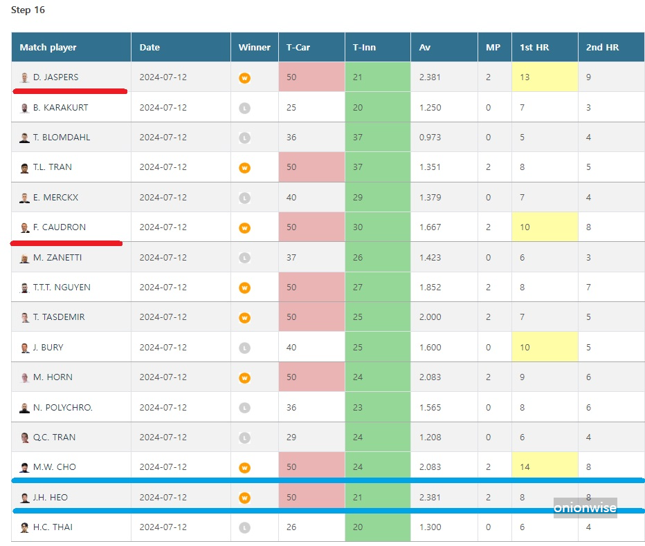 하정한은 베트남 H.C. THAI를 상대로 애버리지 2.381, 하이런 8점을 기록하면서 50:26으로 이기고 8강 진출에 성공했습니다. 조명우는 베트남의 최강자, 트란 퀴엣 치엔을 상대로 애버리지 2.083, 하이런 14점을 기록하면서 50:29로 이기고 8강 진출에 성공했습니다.