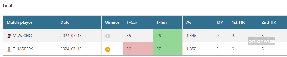 조명우는 25이닝에 9득점 하이런을 치면서 추격했지만 이미 늦었습니다. 야스퍼스는 27이닝에 5점을 올리면서 승부에 마침표를 찍었습니다.
