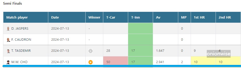 먼저 펼쳐진 조명우 VS 타스데미르 경기결과는 조명우가 애버리지 2.941, 하이런 10점을 연이어 기록하면서 50:28로 이기고, 2024년 포르투 3쿠션 당구 월드컵 결승 대진표에 먼저 이름을 올렸습니다.
