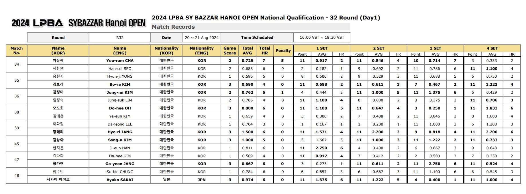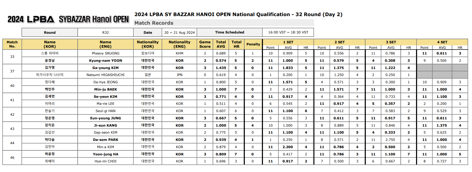■ 2024 에스와이 바자르 하노이 오픈 LPBA 챔피언십 32강 경기결과