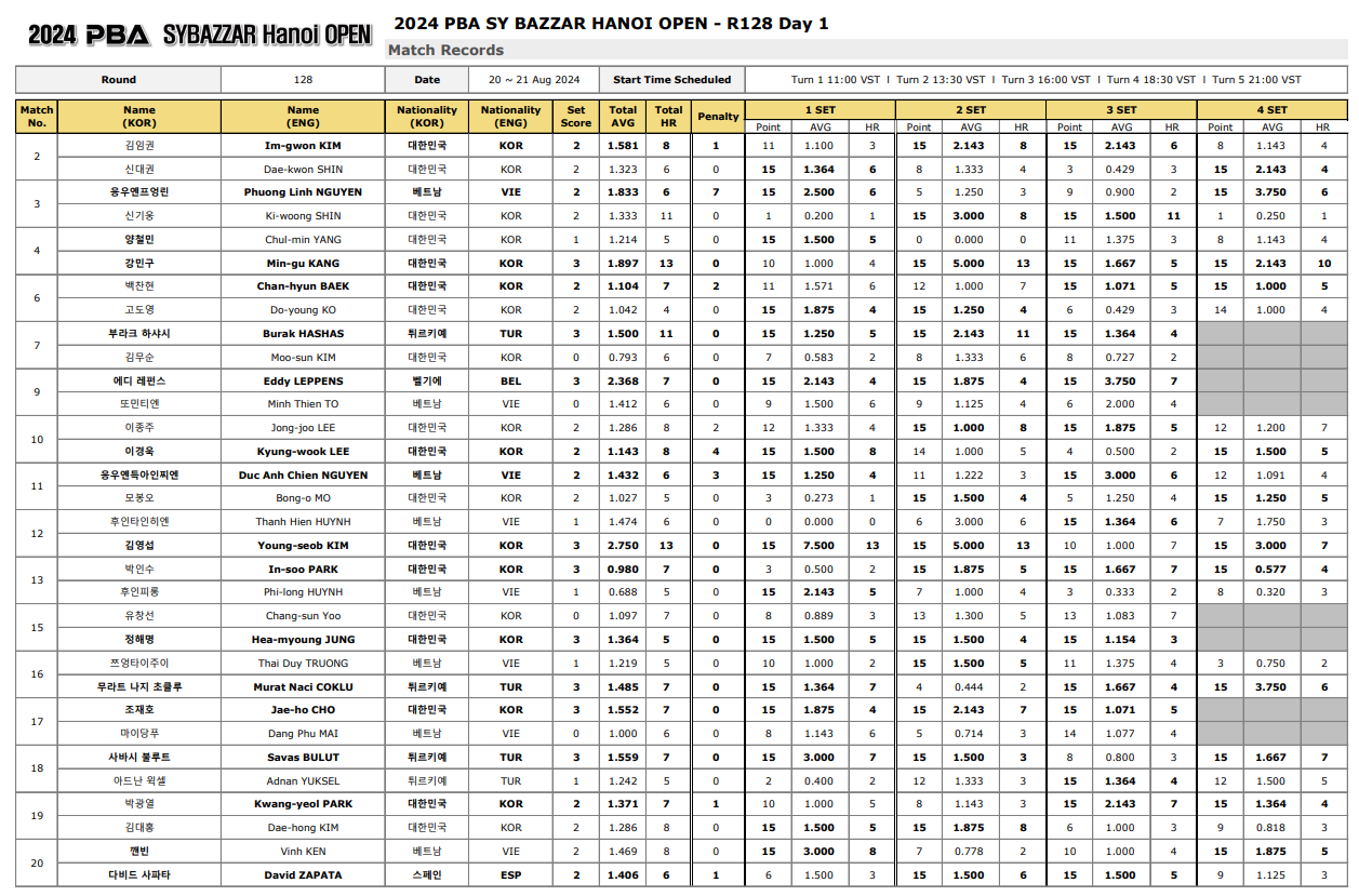 2024 에스와이 바자르 하노이 오픈 PBA 챔피언십 128강 2일 차 경기결과는 다음과 같습니다.