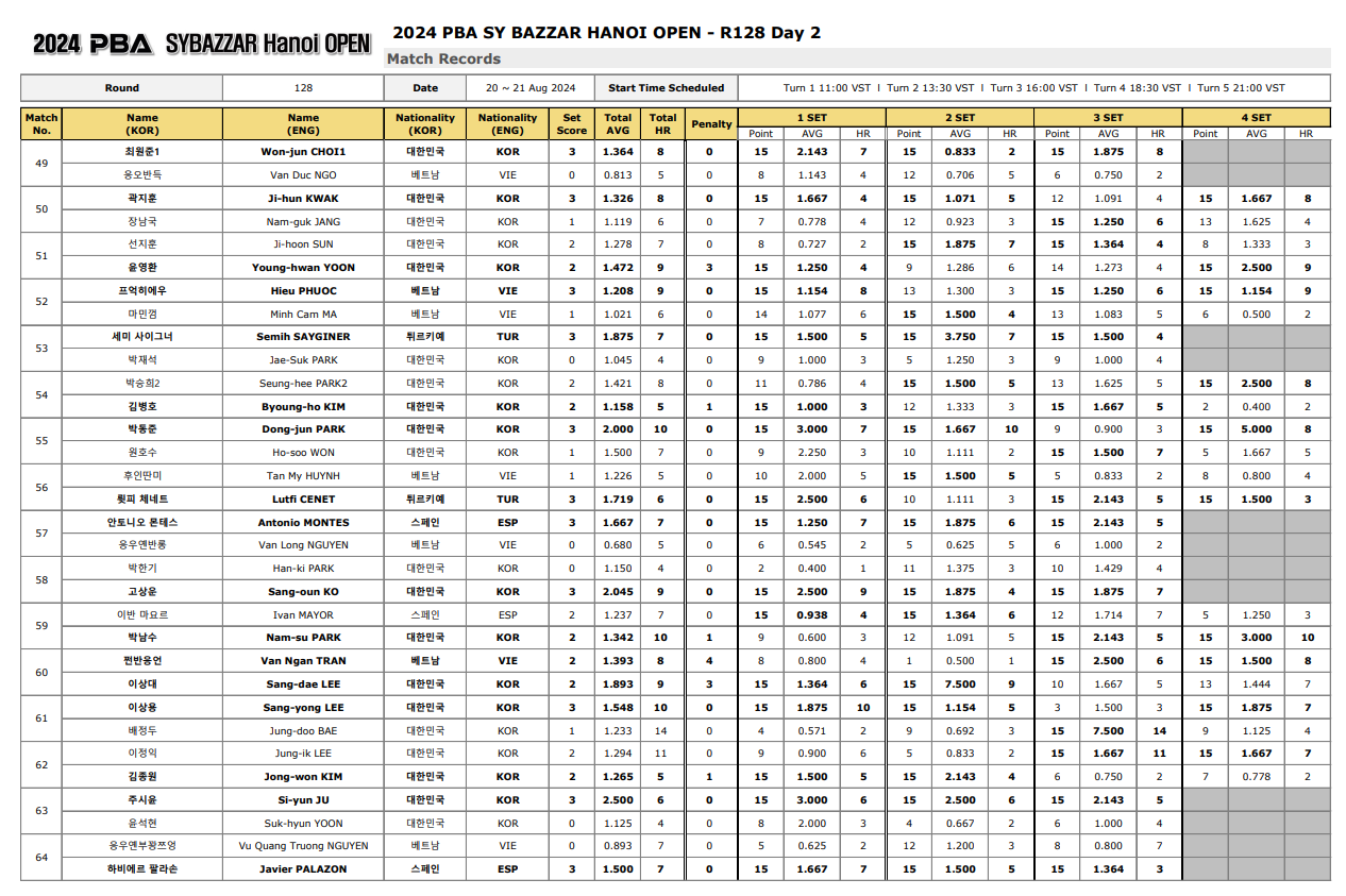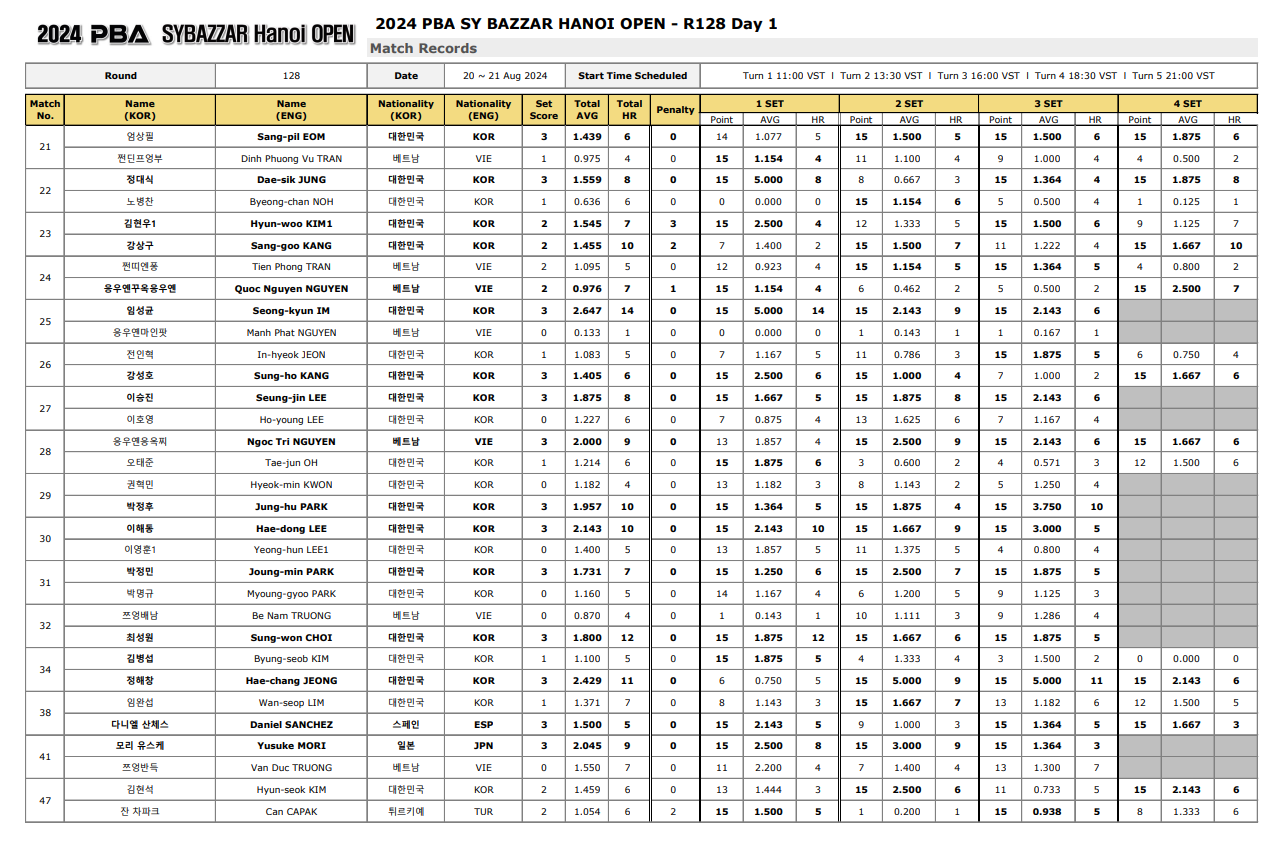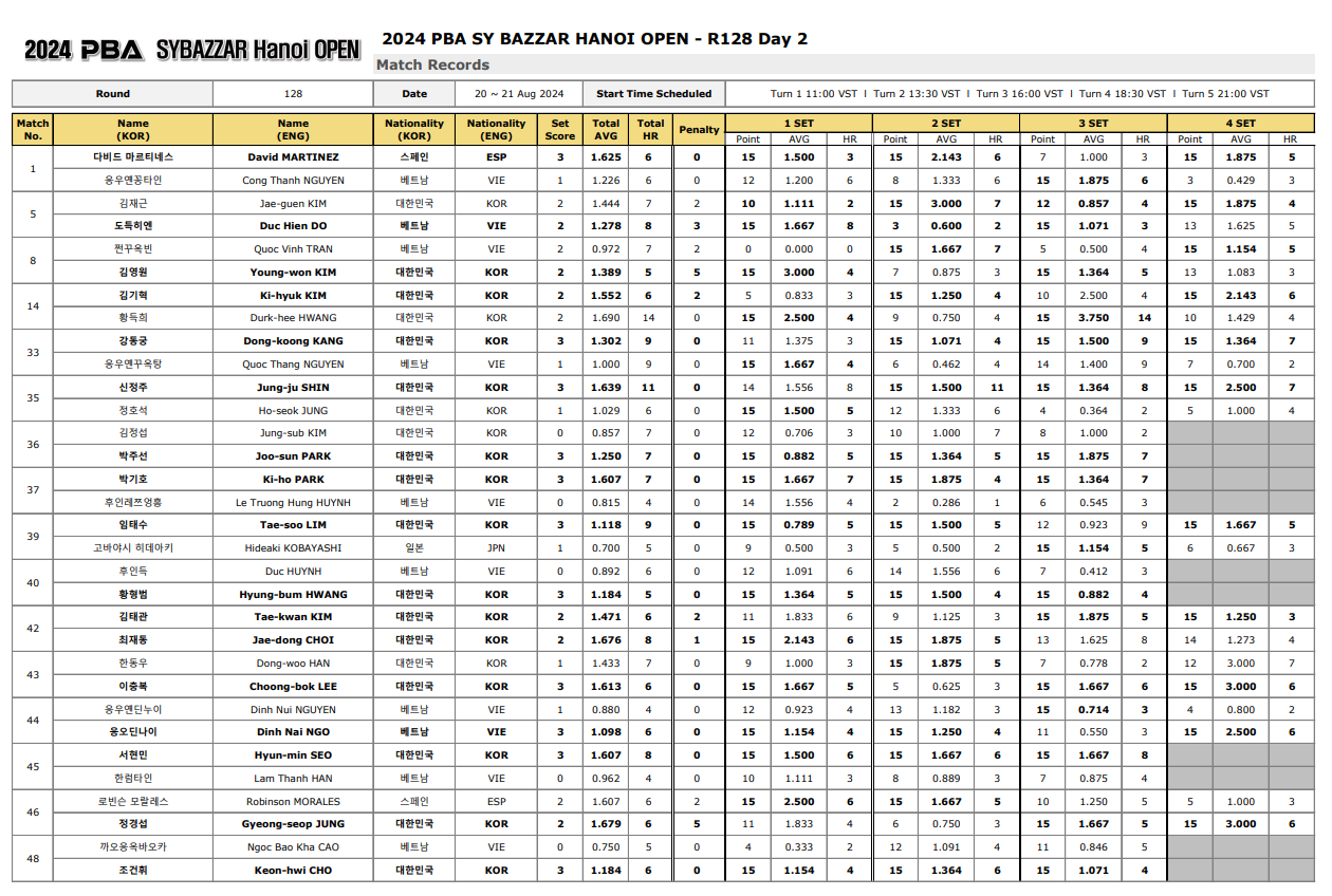 2024 에스와이 바자르 하노이 오픈 PBA 챔피언십 128강 2일 차 경기결과는 다음과 같습니다.