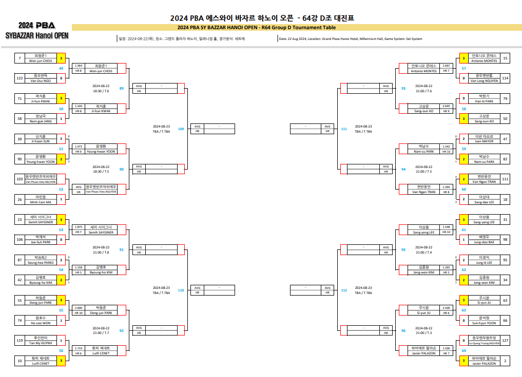 2024 에스와이 바자르 하노이 오픈 PBA 챔피언십 64강 D조 대진표입니다.
