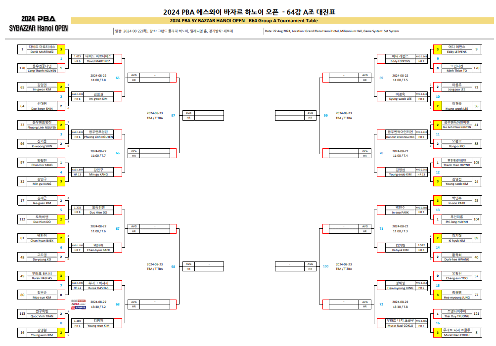 2024 에스와이 바자르 하노이 오픈 PBA 챔피언 64강 대진표 128강 경기결과