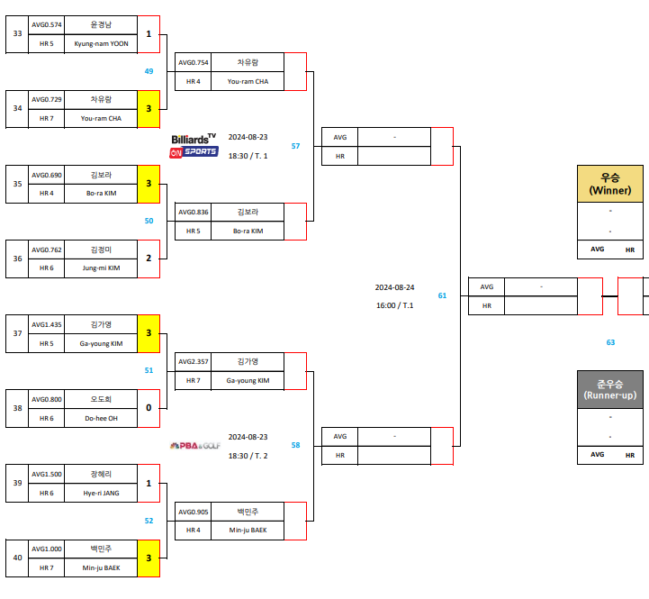 | 에스와이 바자르 하노이 오픈 LPBA 챔피언십 16강 대진표 32강 경기결과 (0) | 2024.08.22 |