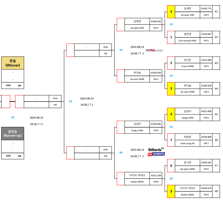 | 에스와이 바자르 하노이 오픈 LPBA 챔피언십 16강 대진표 32강 경기결과 (0) | 2024.08.22 |
